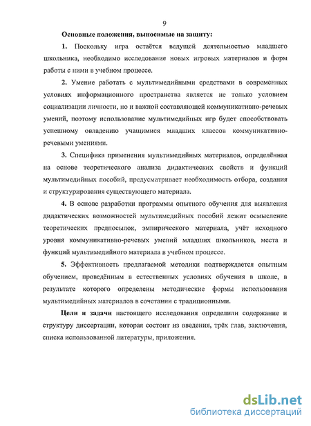 В основу диссертационного исследования положена следующая гипотеза: уровень мотивации к овладению коммуникативно-речевыми умениями и уровень коммуникативно-речевых умений учащихся повысится, если на уроках в начальных классах в сочетании с традиционными формами обучения использовать мультимедийные материалы (компьютерные игры) в контексте специально разработанной методики их введения в образовательный процесс.