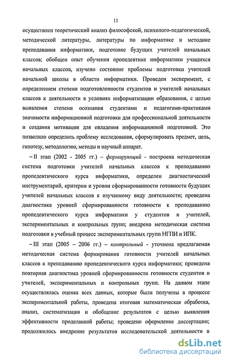 -I этап - констатирующий (2001 - 2002 гг.) - поисково-теоретический осуществлен теоретический анализ философской, психолого-педагогической, методической литературы, литературы по информатике и методике преподавания информатики, подготовке будущих учителей начальных классов; обобщен опыт обучения пропедевтике информатики учащихся начальных классов, изучено состояние проблемы подготовки учителей начальной школы в области информатики. Проведен эксперимент, с определением степени подготовленности студентов и учителей начальных классов к деятельности в условиях информатизации образования, с целью выявления степени осознания студентами и педагогами-практиками значимости информационной подготовки для профессиональной деятельности и создания мотивации для овладения информационной подготовкой. Это позволило определить проблему исследования, сформулировать предмет, цель, гипотезу, методологию, методы и научный аппарат.
