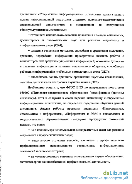 Необходимо отметать, что ФГОС ВПО по направлению подготовки 050400 «Психодого-педагогическое образование» (квалификация (степень) «бакалавр») хотя и содержит в своем перечне дисциплину «Современные информационные технологии)), не определяет содержание обучения данной дисциплине. Анализ учебных планов дисциплин «Информатика», «Математика и информатика», «Информатика и ЭВМ в психологии» и государственных образовательных стандартов предыдущих поколений показгш, что в них: