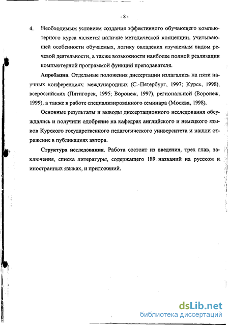 4. Необходимым условием создания эффективного обучающего компьютерного курса является наличие методической концепции, учитывающей особенности обучаемых, логику овладения изучаемым видом речевой деятельности, а также возможности наиболее полной реализации компьютерной программой функций преподавателя. Апробация. Отдельные положения диссертации излагались на пяти научных конференциях: международных (С.-Петербург, 1997; Курск, 1998), всероссийских (Пятигорск, 1995; Воронеж, 1997), региональной (Воронеж, 1999), а также в работе специализированного семинара (Москва, 1998).
