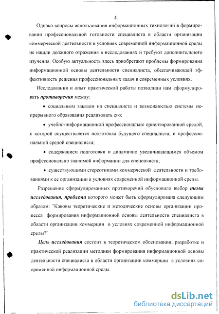 Разрешение сформулированных противоречий обусловило выбор темы исследования, проблема которого может быть сформулирована следующим образом: "Каковы теоретические и методические основы организации процесса формирования информационной основы деятельности специалиста в области организации коммерции в условиях современной информационной среды9"