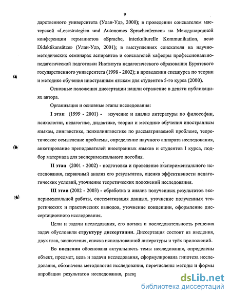 9 дарственного университета (Улан-Удэ, 2000); в проведении соискателем мастерской «Lesestrategien und Autonomes Sprachenlernen» на Международной конференции германистов «Sprache, interkulturelle Kommunikation, neue Didaktikansatze» (Улан-Удэ, 2001); в выступлениях соискателя на научно-методических семинарах аспирантов и соискателей кафедры профессионально-педагогической подготовки Института педагогического образования Бурятского государственного университета (1998 - 2002); в проведении спецкурса по теории и методике обучения иностранным языкам для студентов 5-го курса (2000).