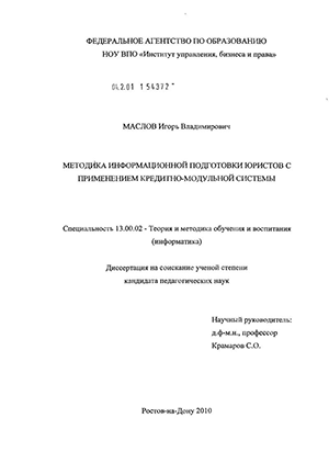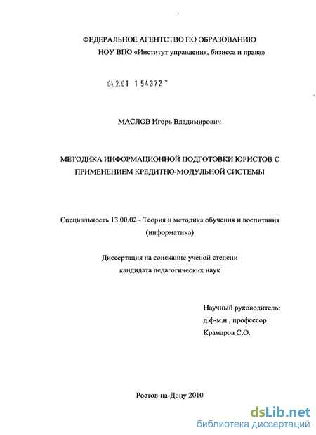 Учитывая указанные выше аспекты, важным представляется исследование проблемы реализации кредитно-модульной системы обучения на различных уровнях и этапах развития условий и средств формирования информационной компетентности юриста. С учетом этого была сформулирована тема исследования - «Методика информационной подготовки юристов с применением кредитно-модульной системы».