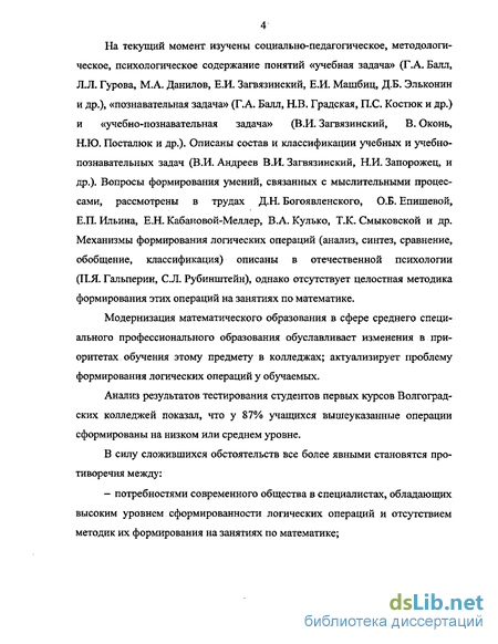 На текущий момент изучены социально-педагогическое, методологическое, психологическое содержание понятий «учебная задача» (Г.А. Балл, Л.Л. Гурова, М.А. Данилов, ЕЛ. Загвязинский, Е.И. Машбиц, Д.Б. Эльконин и др.), «познавательная задача» (Г.А. Балл, Н.В. Градская, П.С. Костюк и др.) и «учебно-познавательная задача» (В.И. Загвязинский, В. Оконь, Н.Ю. Посталюк и др.). Описаны состав и классификации учебных и учебно-познавательных задач (В.И. Андреев В.И. Загвязинский, Н.И. Запорожец, и др.). Вопросы формирования умений, связанных с мыслительными процессами, рассмотрены в трудах Д.Н. Богоявленского, О.Б. Епишевой, Е.П. Ильина, Е.Н. Кабановой-Меллер, В.А. Кулько, Т.К. Смыковской и др. Механизмы формирования логических операций (анализ, синтез, сравнение, обобщение, классификация) описаны в отечественной психологии (П.Я. Гальперин, С.Л. Рубинштейн), однако отсутствует целостная методика формирования этих операций на занятиях по математике.