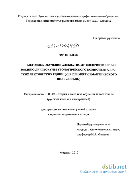 Диссертационная работа выполнена в русле исследований, посвященных созданию национально-ориентированных методик преподавания русского языка как иностранного (далее РКИ), и содержит материалы по проблеме обучения русской темпоральной лексике китайцев, осваивающих русский язык как предмет своей будущей специальности.