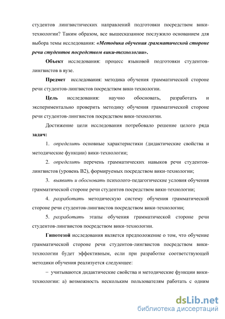 Предмет исследования: методика обучения грамматической стороне речи студентов-лингвистов посредством вики-технологии.