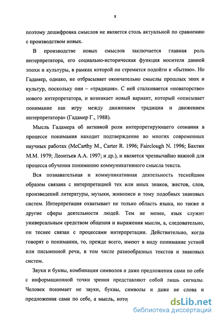 Мысль Гадамера об активной роли интерпретирующего сознания в процессе понимания находит подтверждение во многих современных научных работах (McCarthy М., Carter R. 1996; Fairclough N. 1996; Бахтин М.М. 1979; Леонтьев А.А. 1997; и др.), и является чрезвычайно важной для процесса обучения пониманию коммуникативного смысла текста.