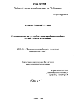 Нерешённость указанной проблемы определила актуальность темы нашего диссертационного исследования «Методика предупреждения ошибок в иноязычной письменной речи (английский язык, языковой вуз)».