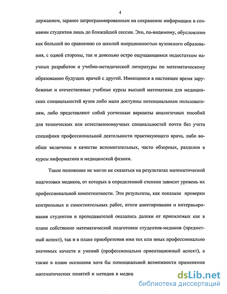 Несмотря на то, что в указанных работах намечен ряд подходов реализации принципа профессиональной направленности математической* подготовки специалистов различного профиля (демонстрация применения математических методов и иллюстрация некоторых математических моделей в избранной области профессиональной деятельности, решение задач с межпредметным содержанием и профессионально ориентированных задач, соединяющих в своей фабуле математический аппарат и элементы профессионального тезауруса), целостного научно обоснованного методического обеспечения студентов-медиков нами в современной методической литературе не обнаружено.