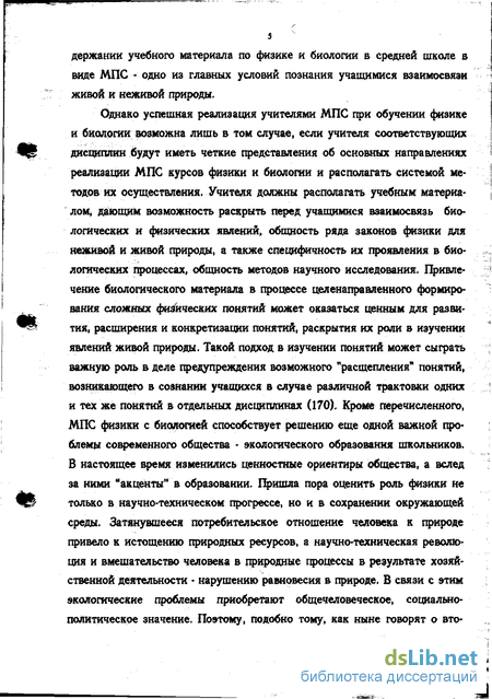 Однако успешная реализация учителями МПС при обучении физике и биологии возможна лишь в том случае, если учителя соответствующих дисциплин будут иметь четкие представления об основных направлениях реализации МПС курсов физики и биологии и располагать системой методов их осуществления. Учителя должны располагать учебным материалом, дающим возможность раскрыть перед учащимися взаимосвязь биологических и физических явлений, общность ряда законов физики для неживой и живой природы, а также специфичность их проявления в биологических процессах, общность методов научного исследования. Привлечение биологического материала в процессе целенаправленного формирования сложных физических понятий может оказаться ценным для развития, расширения и конкретизации понятий, раскрытия их роли в изучении явлений живой природы. Такой подход в изучении понятий может сыграть важную роль в деле предупреждения возможного "расщепления понятий, возникающего в сознании учащихся в случае различной трактовки одних и тех же понятий в отдельных дисциплинах (170). Кроме перечисленного, МПС физики с биологией способствует решению еще одной важной проблемы современного общества - экологического образования школьников. В настоящее время изменились ценностные ориентиры общества, а вслед за ними "акценты" в образовании. Пришла пора оценить роль физики не только в научно-техническом прогрессе, но и в сохранении окружающей среды. Затянувшееся потребительское отношение человека к природе привело к истощению природных ресурсов, а научно-техническая революция и вмешательство человека в природные процессы в результате хозяйственной деятельности - нарушению равновесия в природе. В связи с этим экологические проблемы приобретают общечеловеческое, социально-политическое значение. Поэтому, подобно тому, как ныне говорят о вто б рой компьютерной грамотности, можно утверждать, что каждый человек должен быть грамотным и в вопросах экологии. Решение данной проблемы возможно посредством осуществления МПС физики с биологией. Данной проблеме обучения уделялось большое внимание в работах М.М.Л1ирбабаева, А.Уразалиева, Э-А.Турдикулова, А.Н.Захлебного, ЕВ.Огородникова и других ( 45, 116, 120, 160, 161, 167, 221),