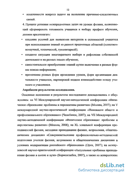 Проведенный в процессе диссертационного исследования анализ учебно-методической, учебной литературы, диссертационных работ в области методики обучения физике позволяет сделать вывод, что в настоящее время на уроках физики фактически не создаются условия, способствующие осознанному самоопределению учащихся в выборе дальнейшей образовательной траектории, в том числе и в выборе профиля обучения.