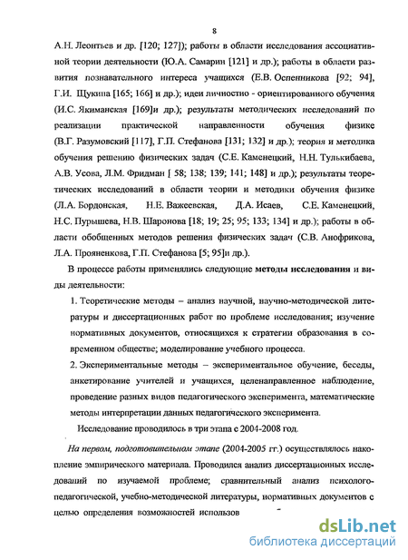 8 А.Н. Леонтьев и др. [120; 127]); работы в области исследования ассоциативной теории деятельности (Ю.А. Самарин [121] и др.); работы в области развития познавательного интереса учащихся (Е.В. Оспенникова [92; 94], Г.И. Щукина [165; 166] и др.); идеи личностно - ориентированного обучения (И.С. Якиманская [169]и др.); результаты методических исследований по реализации практической направленности обучения физике (В.Г. Разумовский [117], Г.П. Стефанова [131; 132] и др.); теория и методика обучения решению физических задач (СЕ. Каменецкий, Н.Н. Тулькибаева, А.В. Усова, Л.М. Фридман [ 58; 138; 139; 141; 148] и др.); результаты теоретических исследований в области теории и методики обучения физике (Л.А. Бордонская, Н.Е. Важеевская, Д.А. Исаев, СЕ. Каменецкий, Н.С. Пурышева, Н.В. Шаронова [18; 19; 25; 95; 133; 134] и др.); работы в области обобщенных методов решения физических задач (СВ. Анофрикова, Л.А. Прояненкова, Г.П. Стефанова [5; 95]и др.).