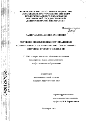 Актуальность данной проблемы, ее теоретическая и практическая неразработанность явились основанием для определения темы исследования: «Обучение иноязычной коммуникативной компетенции студентов-лингвистов в условиях ингушско-русского двуязычия».