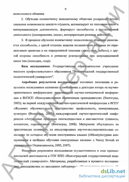 Апробация результатов исследования: основные положения и результаты исследования изложены в сообщениях и докладах автора на научно-практических конференциях ВГПУ, ВИЭСП, на первой международной научно-практической конференции в ВГПУ «Языковое образовательное пространство: профильность, коммуникация, культура» (сентябрь, 2005). Материалы обсуждались на практических семинарах, на международных научно-исследовательских семинарах по методике обучения иностранным языкам («Межкультурная коммуникация в методике обучения иностранным языкам» с Nancy Borosh из университета Индианаполиса, 2005,2007 год).