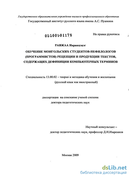 Объект исследования. Процесс обучения монгольских студентов-программистов профессиональному общению на русском языке на основе русских текстов, содержащих дефиниции компьютерных терминов.