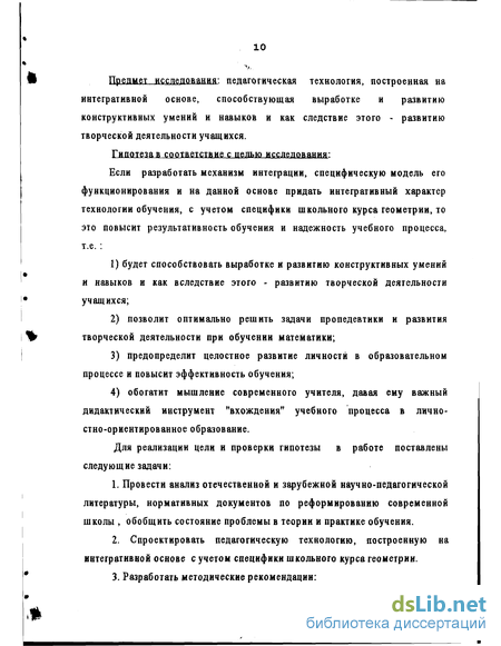 Предмет исследования: педагогическая технология, построенная на интегративной основе, способствующая выработке и развитию конструктивных умений и навыков и как следствие этого - развитию творческой деятельности учащихся.