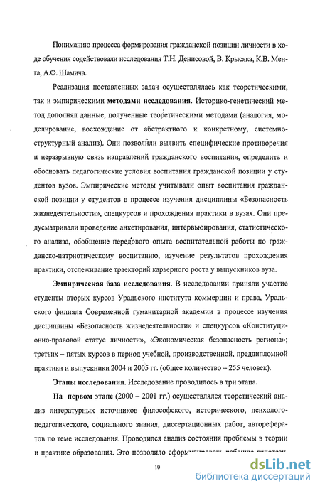 Особое влияние на логику исследования оказали работы отечественных педагогов: В.А. Антошина, К.П. Буртного, Р.А. Дмитриева, А.В. Мельникова, Е.А. Олейникова, Б.Н. Порфирьева, В.В. Русинова, Ю.В. Репина, В.В. Сапронова, Л.И. Шершнева об активизации познавательной деятельности в области безопасности жизнедеятельности и национальной безопасности. Пониманию процесса формирования гражданской позиции личности в образовательном процессе в учебных заведениях содействовали исследования Т.Н. Денисовой, В. Крысяка, К.В. Менга, А.Ф. Шамича. Однако несмотря на масштабные исследования в данной области, проблема формирования гражданской позиции студентов в период политических, социально-экономических, образовательных реформ не потеряла своей актуальности.