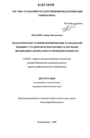 Апробация и внедрение результатов исследования осуществлялись в практической и преподавательской деятельности и нашли отражение в публикациях автора. Материалы диссертационного исследования докладывались на международных, всероссийских, региональных межвузовских научно-практических конференциях, организованных в Уральском государственном педагогическом университете (Екатеринбург, 2006), при Правительстве Свердловской области (Екатеринбург, 2005), Гуманитарном университете (Екатеринбург, 2005), Уральском институте коммерции и права (Екатеринбург, 2004, 2005), в Екатеринбургском военном артиллерийском командном училище (военном институте) (Екатеринбург, 2004, 2005), Уральском финансово-юридическом институте (Екатеринбург, 2006). Разработаны и внедрены в образовательный процесс учебно-методические комплексы по дисциплине «Безопасность жизнедеятельности» в Уральском филиале Российской правовой академии и Уральском институте коммерции и права.