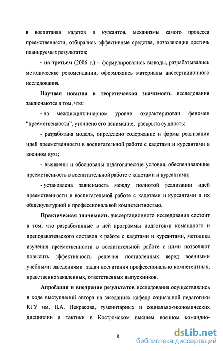 Практическая значимость диссертационного исследования состоит в том, что разработанные в ней программы подготовки командного и преподавательского составов к работе с кадетами и курсантами, методика изучения преемственности в воспитательной работе с ними позволяют повысить эффективность решения поставленных перед военными учебными заведениями задач воспитания профессионально компетентных, нравственно закаленных, ответственных выпускников.