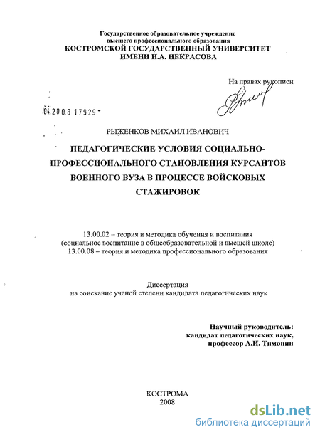 А. Глоточкин, В.П. Давыдов, Н.М. Мороз); подходы к проблеме подготовки будущих офицеров (А.В. Барабанщиков, И.В. Биочинский, В.В. Бондарь, А.К. Быков, Н.Т. Волков, СП. Желтобрюх, В.Г. Звягинцев, А.Ф. Ильин, В.П. Иванов, С.С. Муцинов, В.М. Савка, В.В. Соглаев, Г.А. Шабанов, Ю.В. Шеремет, Г.И. Шпак); принципы личностного подхода, субъектного взаимодействия и продуктивного общения (В.Г. Ананьев, А.А. Бодалев, Е.Г. Злобина); концепция социально-педагогического обеспечения педагогических процессов (А.В. Вол охов, А.И. Тимонин); положения о системном целостном подходе (С.Д. Поляков, М.Н. Скаткин, И.Е. Хоменко), раскрывающих логику педагогического исследования и построения программы педагогического обеспечения социально-профессионального становления курсанта военного вуза в процессе войсковых стажировок.