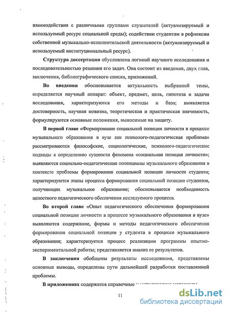 Во второй главе «Опыт педагогического обеспечения формирования социальной позиции личности в процессе музыкального образования в вузе» выявляются содержание, формы и методы педагогического обеспечения формирования социальной позиции у студента в процессе музыкального образования; характеризуется процесс реализации программы опытно-экспериментальной работы; представляется анализ ее результатов.
