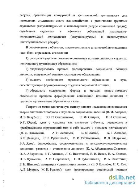 обоснованными в исследованиях Т. Адорно, П. Гуревича, Н. Александрова, Л. Бочкарёва, М. Вебера, В. Григорьева, Э. Курта, А. Лосева, Н. Лосского, А. Маслоу, С. Мильтоняна, К. Серебровской, П. Сорокина, А. Субетто, К. Тарасовой, А. Тимонина, Ю. Хабермасса, В. Холоповой, Ю. Цагерелли, Т. Чередниченко, А. Шептулина, П. Энгельмейера, является требование целостного, деятельностно-ориентированного подхода к педагогическому обеспечению формирования социальной позиции личности в процессе музыкального образования в вузе.