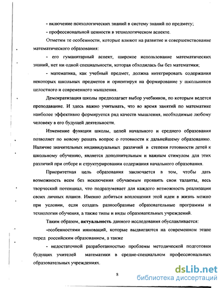 Таким образом, актуальность данного исследования обуславливается: -особенностями инноваций, которые выдвигаются на современном этапе перед российским образованием, а также - недостаточной разработанностью проблемы методической подготовки будущих учителей математики в средне-специальном профессиональных образовательных учреждениях.