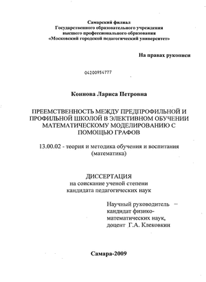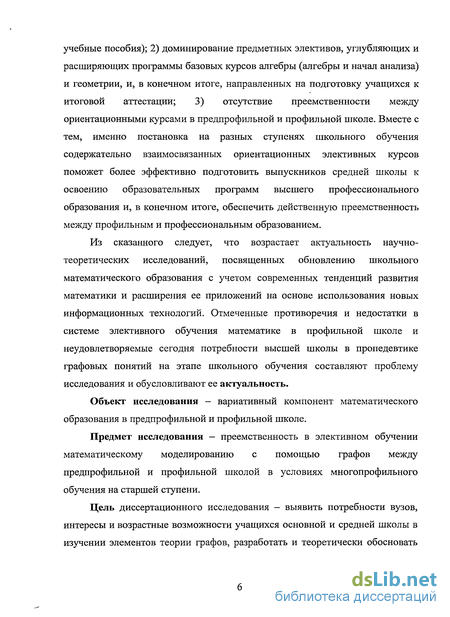 Предмет исследования - преемственность в элективном обучении математическому моделированию с помощью графов между предпрофильной и профильной школой в условиях многопрофильного обучения на старшей ступени.