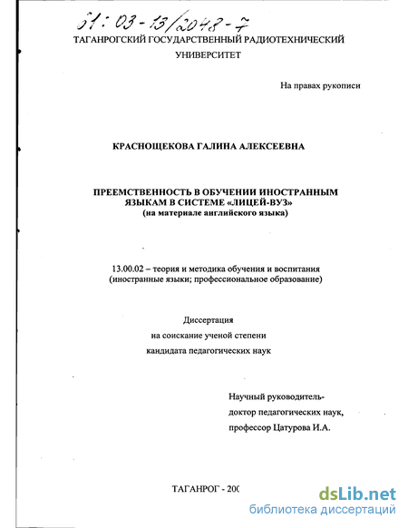 Целью диссертационной работы является исследование процесса преемственности в обучении иностранному языку в системе «лицей - вуз».