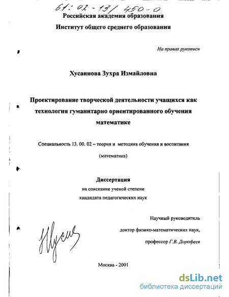 Проблеме развития личности учащихся в процессе овладения ими математическими знаниями уделяли постоянное внимание крупные математики, психологи, методисты. Роль математики в формировании мышления, языка и речи, научного мировоззрения исследовались в работах Ж. Адамара, В.Г. Болтянского, Г.Х. Танеева, Б.В Гнеденко, Г.В. Дорофеева, А.Г. Ковалева, А.Н. Колмогорова, В.А. Крутецкого, А.И. Маркушевича, Д. Пойя, А.А. Столяра, СИ. Шварцбурда, А.Я.. Хинчина, Н.А. Менчинской, Г, Фройденталя, JLM. Фридмана и др. По словам А.И. Маркушевича „развивать творческие потенции ученика можно только включая его в творческую деятельность. Никакой рассказ о ней и даже показ ее не может научить творчеству.