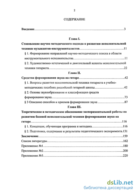 Структура работы. Диссертация состоит из введения, трех глав, заключения, списка литературы, состоящего из 224 источников, в том числе 171 на русском, 53 на английском, немецком и испанском языках. Работа включает приложения с контрольными тестами участников констатирующего и контрольного этапов эксперимента, а также с названиями и электронными адресами сайтов журналов, посвященных гитарному искусству (43 источника). Основной текст диссертации изложен на 161 странице.