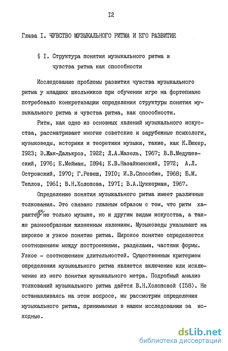 Ритм, как одно из основных явлений музыкального искусства, рассматривают многие советские и зарубежные психологи, музыковеды, историки и теоретики музыки, такие, как К.Бюхер, 1923; Э.Жак-Далькроз, 1922; Л.А.Мазель, 1967; В.В.Медушев-ский, 1976; Е.Мейман, 1894; Е.В.Назайкинский, 1972; А.Л. Островский, 1970; Г.Ревеш, 1910; И.В.Способин, 1968; Б.М. Теплов, 1961; В.Н.Холопова, 1971; В.А.Цуккерман, 1967.