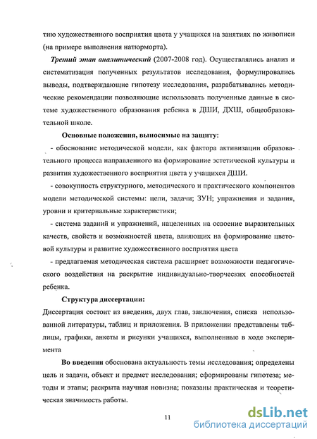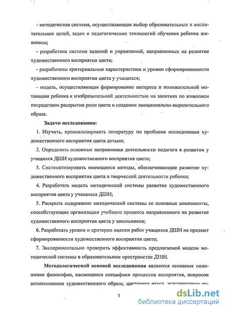 Рассматривая в диссертационном исследовании проблему развития художественного восприятия цвета у учащихся ДШИ, показало, что знания, которые получает школьник, практические задания, предлагаемые учителем по живописи, не способствуют формированию образного понимания действительности, в котором художественное видение служит целенаправленному воспитанию цветовой культуры и раскрытию творческих способностей.