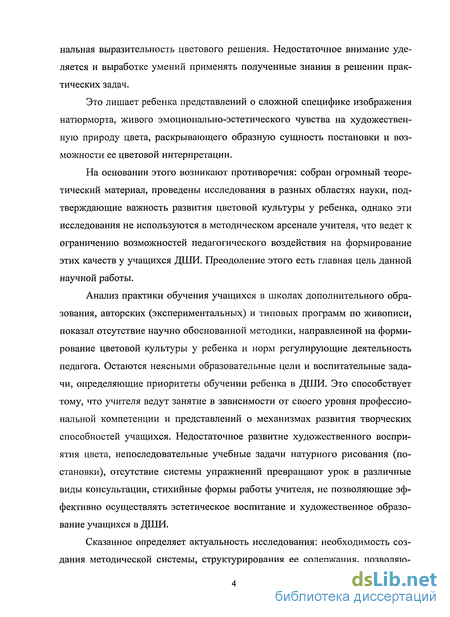 Анализ практики обучения учащихся в школах дополнительного образования, авторских (экспериментальных) и типовых программ по живописи, показал отсутствие научно обоснованной методики, направленной на формирование цветовой культуры у ребенка и норм регулирующие деятельность педагога. Остаются неясными образовательные цели и воспитательные задачи, определяющие приоритеты обучении ребенка в ДШИ. Это способствует тому, что учителя ведут занятие в зависимости от своего уровня профессиональной компетенции и представлений о механизмах развития творческих способностей учащихся. Недостаточное развитие художественного восприятия цвета, непоследовательные учебные задачи натурного рисования (постановки), отсутствие системы упражнений превращают урок в различные виды консультации, стихийные формы работы учителя, не позволяющие эффективно осуществлять эстетическое воспитание и художественное образование учащихся в ДШИ.