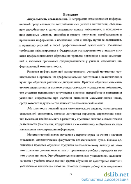 Необходимость разрешения указанных противоречий обусловливает актуальность диссертационного исследования, а также определяет его проблему: как в процессе обучения математическому анализу обеспечить развитие информационной компетентности студентов заочных отделений педагогических вузов?