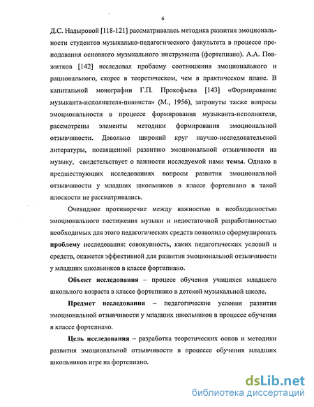 6 Д.С. Надыровой [118-121] рассматривалась методика развития эмоциональности студентов музыкально-педагогического факультета в процессе преподавания основного музыкального инструмента (фортепиано). А.А. Пов-житков [142] исследовал проблему соотношения эмоционального и рационального, скорее в теоретическом, чем в практическом плане. В капитальной монографии Г.П. Прокофьева [143] «Формирование музыканта-исполнителя-пианиста» (М., 1956), затронуты также вопросы эмоциональности в процессе формирования музыканта-исполнителя, рассмотрены элементы методики формирования эмоциональной отзывчивости. Довольно широкий круг научно-исследовательской литературы, посвященной развитию эмоциональной отзывчивости на музыку, свидетельствует о важности исследуемой нами темы. Однако в предшествующих исследованиях вопросы развития эмоциональной отзывчивости у младших школьников в классе фортепиано в такой плоскости не рассматривались.