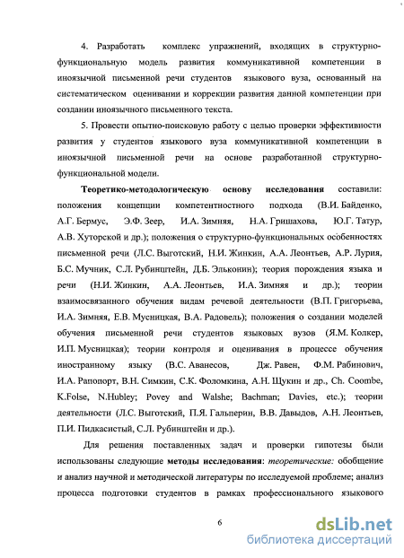 Теоретико-методологическую основу исследования составили: положения концепции компетентностного подхода (В.И. Байденко, А.Г. Бермус, Э.Ф. Зеер, И.А. Зимняя, Н.А. Гришахова, Ю.Г. Татур, А.В. Хуторской и др.); положения о структурно-функциональных особенностях письменной речи (Л.С. Выготский, Н.И. Жинкин, А.А. Леонтьев, А.Р. Лурия, Б.С. Мучник, С.Л. Рубинштейн, Д.Б. Эльконин); теория порождения языка и речи (Н.И. Жинкин, А.А. Леонтьев, И.А. Зимняя и др.); теории взаимосвязанного обучения видам речевой деятельности (В.П. Григорьева, И.А. Зимняя, Е.В. Мусницкая, В.А. Радовель); положения о создании моделей обучения письменной речи студентов языковых вузов (Я.М. Колкер, И.П. Мусницкая); теории контроля и оценивания в процессе обучения иностранному языку (В.С. Аванесов, Дж. Равен, Ф.М. Рабинович, И.А. Рапопорт, В.Н. Симкин, С.К. Фоломкина, А.Н. Щукин и др., Ch. Coombe, K.Folse, N.Hubley; Povey and Walshe; Bachman; Davies, etc.); теории деятельности (Л.С. Выготский, П.Я. Гальперин, В.В. Давыдов, А.Н. Леонтьев, П.И. Пидкасистый, С.Л. Рубинштейн и др.).