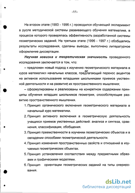 Наиболее полно они раскрыты в работах A.M. Пышкало [128, 129, 130, 131, 132]. Большой вклад в разработку методики обучения младших школьников внесли психологические и методические исследования по проблеме формирования у младших школьников пространственных представлений [27, 54, 56, 109, 114, 121 и др.] и пространственных отношений [120].
