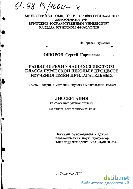 Объектом исследования является познавательная деятельность учащихся бурятских национальных школ при изучении имен прилагательных.