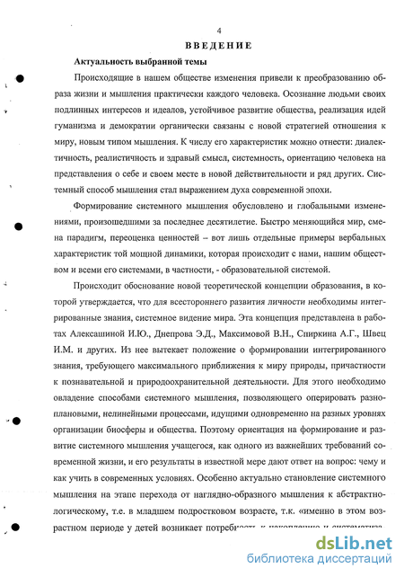 Происходит обоснование новой теоретической концепции образования, в которой утверждается, что для всестороннего развития личности необходимы интегрированные знания, системное видение мира. Эта концепция представлена в работах Алексашиной И.Ю., Днепрова Э.Д., Максимовой В.Н., Спиркина А.Г., Швец И.М. и других. Из нее вытекает положение о формировании интегрированного знания, требующего максимального приближения к миру природы, причастности к познавательной и природоохранительной деятельности. Для этого необходимо овладение способами системного мышления, позволяющего оперировать разноплановыми, нелинейными процессами, идущими одновременно на разных уровнях организации биосферы и общества. Поэтому ориентация на формирование и развитие системного мышления учащегося, как одного из важнейших требований современной жизни, и его результаты в известной мере дают ответ на вопрос: чему и как учить в современных условиях. Особенно актуально становление системного мышления на этапе перехода от наглядно-образного мышления к абстрактно-логическому, т.е. в младшем подростковом возрасте, т.к. «именно в этом возрастном периоде у детей возникает потребность к накоплению и систематиза ции знаний» (Божович Л.И.).