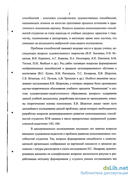 Проблема способностей занимает ведущее место в трудах ученых, исследующих вопросы художественного творчества (В.П. Зинченко, Е.И. Игнатьев, В.И. Киреенко, А.Г. Ковалев, ЯЛ. Пономарев, К.К. Платонов, Б.М. Теплов, П.М. Якобсон и др.). Ряд работ посвящен вопросам формирования изобразительных способностей в процессе целенаправленного обучения и воспитания (B.C. Кузин, Н.Н. Ростовцев, Т.С. Комарова, Е.В. Шорохов, СЕ. Игнатьев, А.С. Пучков, А.В. Триселев и др.). Особого внимания заслуживают исследования Е.В. Шорохова, в которых впервые было произведено научно-теоретическое обоснование учебного предмета "Композиция" в системе художественно-педагогического образования, раскрыто содержание данной учебной дисциплины, разработана методика ее преподавания, описаны теоретические основы композиции. Е.В. Шорохов указал также пути дальнейшего исследования данной проблемы, среди которых необходимость разработки вопросов целенаправленного развития композиционных способностей студентов ХГФ названа в числе приоритетных направлений художественной педагогики/185, 186/.
