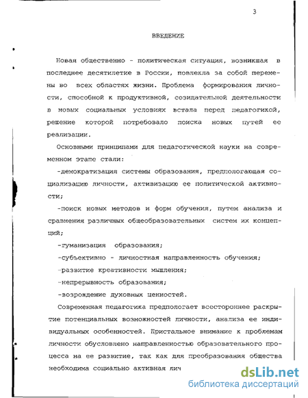 Новая общественно - политическая ситуация, возникшая в последнее десятилетие в России, повлекла за собой перемены во всех областях жизни. Проблема формирования личности, способной к продуктивной, созидательной деятельности в новых социальных условиях встала перед педагогикой, решение которой потребовало поиска новых путей ее реализации.