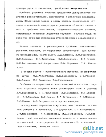 Проблема развития личности средствами декоративного искусства рассматривалась многократно в различных исследованиях. Объективный подход к этому вопросу предпологает изучение специальной литературы в различных областях знания -это и проблемы психологии, общепедагогические аспекты, современные положения дидактики обучения, научные труды по развитию личности средствами художественного образования и ДР-