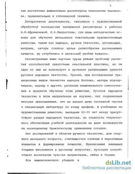 Рассмотренные выше научные труды решают проблему развития способностей средствами текстильной пластики, но ни одно из них не использует в арсенале развивающих средств русское народное ткачество- Причем, при исследовании традиционных видов ткачества народов Востока, авторы подчеркивали, наряду с другим, развитие национального самосознания в процессе обучения этим ремеслам. Русское народное ткачество в этом направлении не изучено, нет современных методик преподавания, оно не входит даже составной частью в специальную литературу по этому профилю. В учебниках по художественным ремеслам, вышедшим 20-3 0 лет назад присутствует раздел народного ткачества, но сложность технического обеспечения учебной деятельности не дает возможности их полноценному практическому применению сегодня.