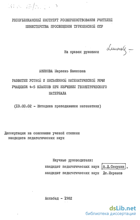 на основе этих теоретических положений разработаны конкретные методические рекомендации и учебные материалы по развитию математической речи учащихся 4-5 классов при изучении ими геометрического материала; существенными компонентами этих материалов являются опорные обороты речи по каждой геометрической теме, этимологический словарь терминов, употребляемых при изучении геометрического материала в 4-5 классах школ с русским и туркменским языками обучения, идеографический словарь-минимум по геометрическому материалу этих классов;
