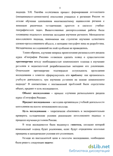 5 подхода. З.Н. Ткачёва исследовала процесс формирования личностного (эмоционально-ценностного) отношения учащихся к регионам России на основе обучения школьников многоаспектному оцениванию региона с помощью различных методических приемов и системы учебно-географических задач. Вышеназванные диссертационные работы были посвящены отдельным аспектам методики изучения регионов. Методология комплексного подхода, понимаемая как стратегия изучения целостного сложно-организованного объекта, в методике географии пока не разработана. Методических исследований по этой проблеме не проводилось.