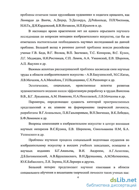 Проблемы изучения процесса специальной подготовки студентов по изобразительному искусству в высших учебных заведениях освещены Б Г Ананьевым, В И Андреевым, А Г. Асмоловым, Д Б Богоявленской, А В Брушлинским, В Н Дружининым, А М Ма-тюшкиным, Ю К Бабанским, Л Я Зориным, И Я Лернером и др