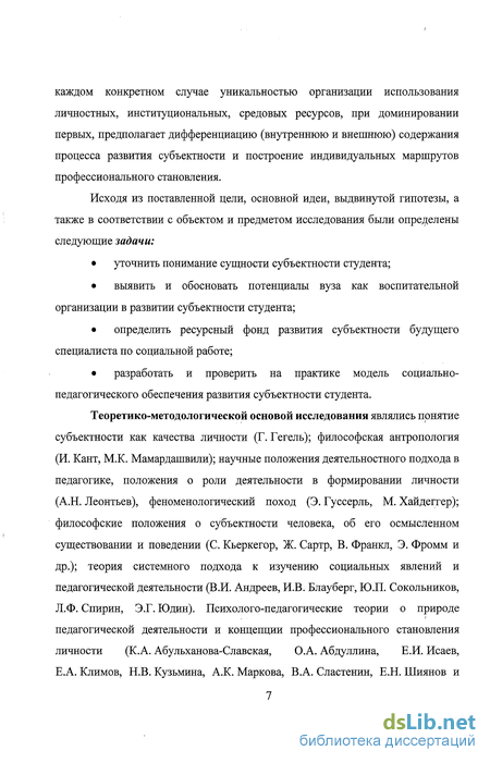 Теоретико-методологической основой исследования являлись понятие субъектности как качества личности (Г. Гегель); философская антропология (И. Кант, М.К. Мамардашвили); научные положения деятельностного подхода в педагогике, положения о роли деятельности в формировании личности (А.Н. Леонтьев), феноменологический поход (Э. Гуссерль, М. Хайдеггер); философские положения о субъектности человека, об его осмысленном существовании и поведении (С. Кьеркегор, Ж. Сартр, В. Франки, Э. Фромм и др.); теория системного подхода к изучению социальных явлений и педагогической деятельности (В.И. Андреев, И.В. Блауберг, Ю.П. Сокольников, Л.Ф. Спирин, Э.Г. Юдин). Психолого-педагогические теории о природе педагогической деятельности и концепции профессионального становления личности (К.А. Абульханова-Славская, О.А. Абдуллина, Е.И. Исаев, Е.А. Климов, Н.В. Кузьмина, А.К. Маркова, В.А. Сластенин, Е.Н. Шиянов и
