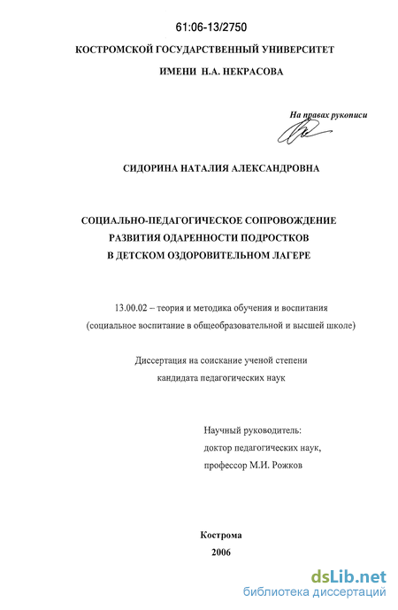 Предмет: процесс реализации социально-педагогического сопровождения развития одаренности подростков в детском оздоровительном лагере.