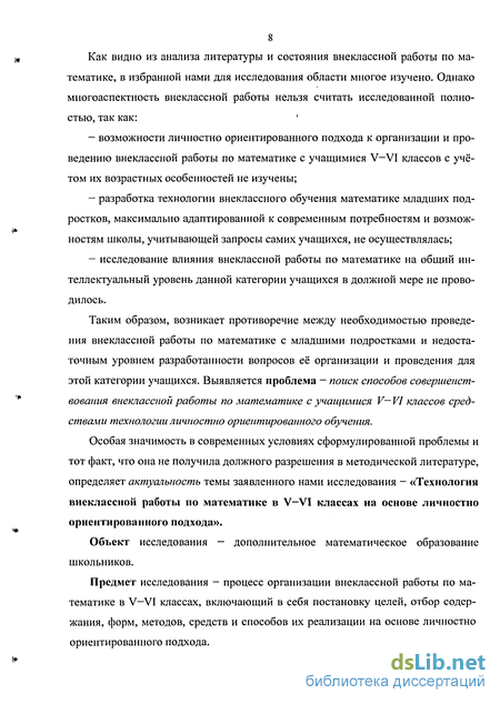 Особая значимость в современных условиях сформулированной проблемы и тот факт, что она не получила должного разрешения в методической литературе, определяет актуальность темы заявленного нами исследования - «Технология внеклассной работы по математике в V—VI классах на основе личностно ориентированного подхода».